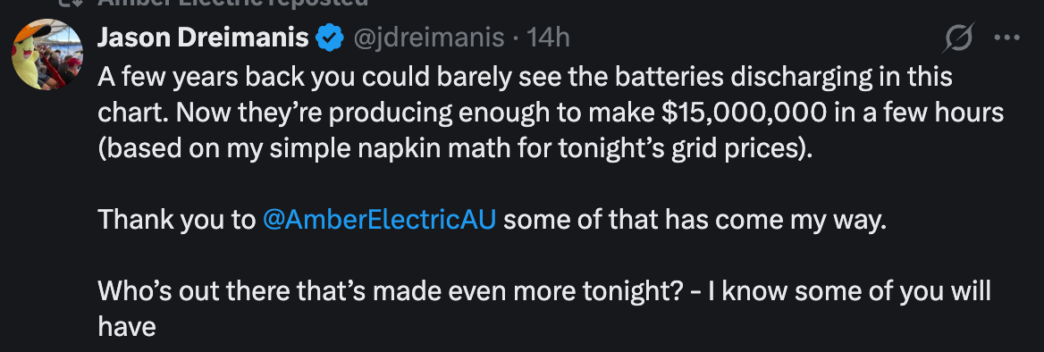 What batteries are changing is who profits from that volatility - shifting it away from coal and gas generators and toward households. The gap between cheap and expensive energy doesn't disappear, it evolves. And finding that gap, wherever it moves, is exactly what Amber is built to do.